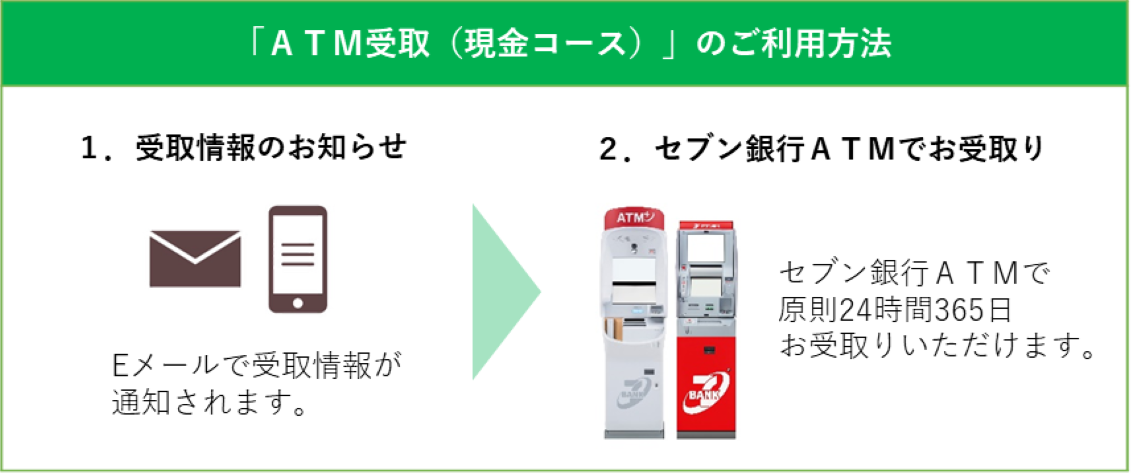 セブン・ペイメントサービスが提供する「ATM受取(現金コース)」は、企業から個人への送金を、セブン銀行ATMとセブン‐イレブンのレジ等にて銀行口座を介さず現金で受取ることができるサービスです。